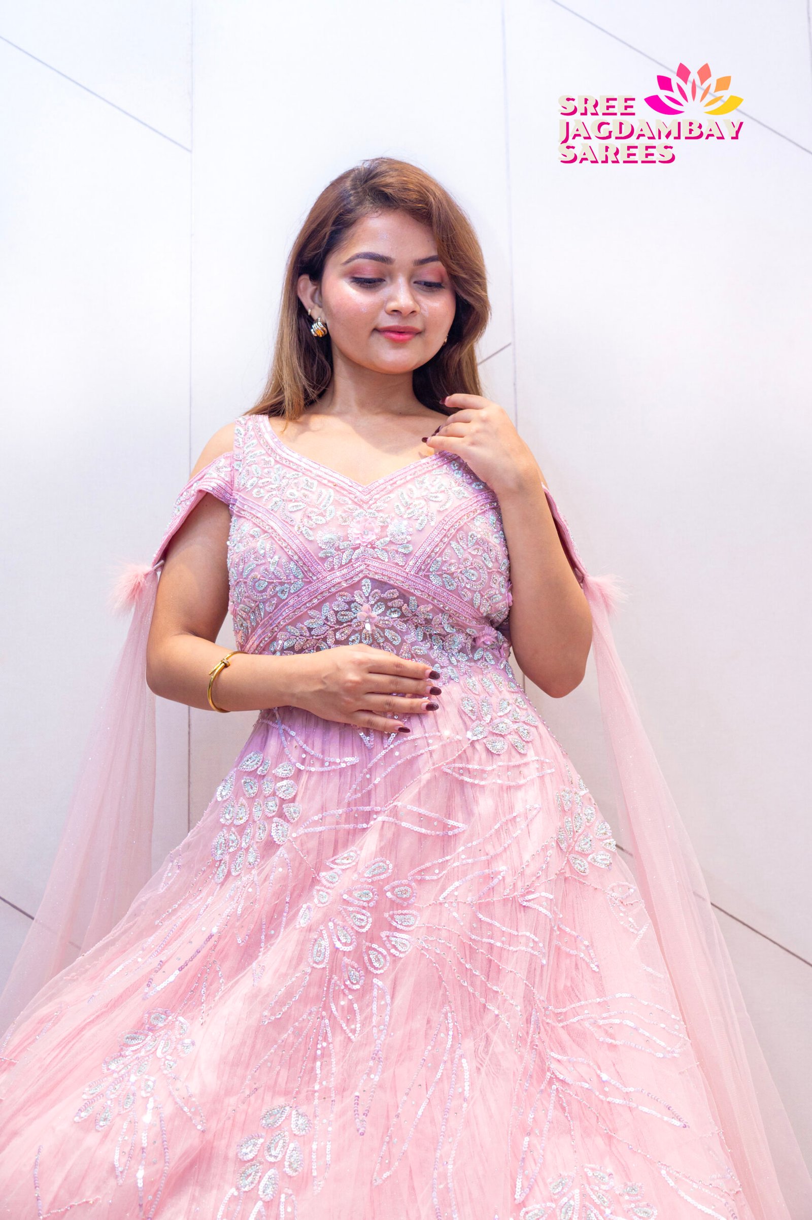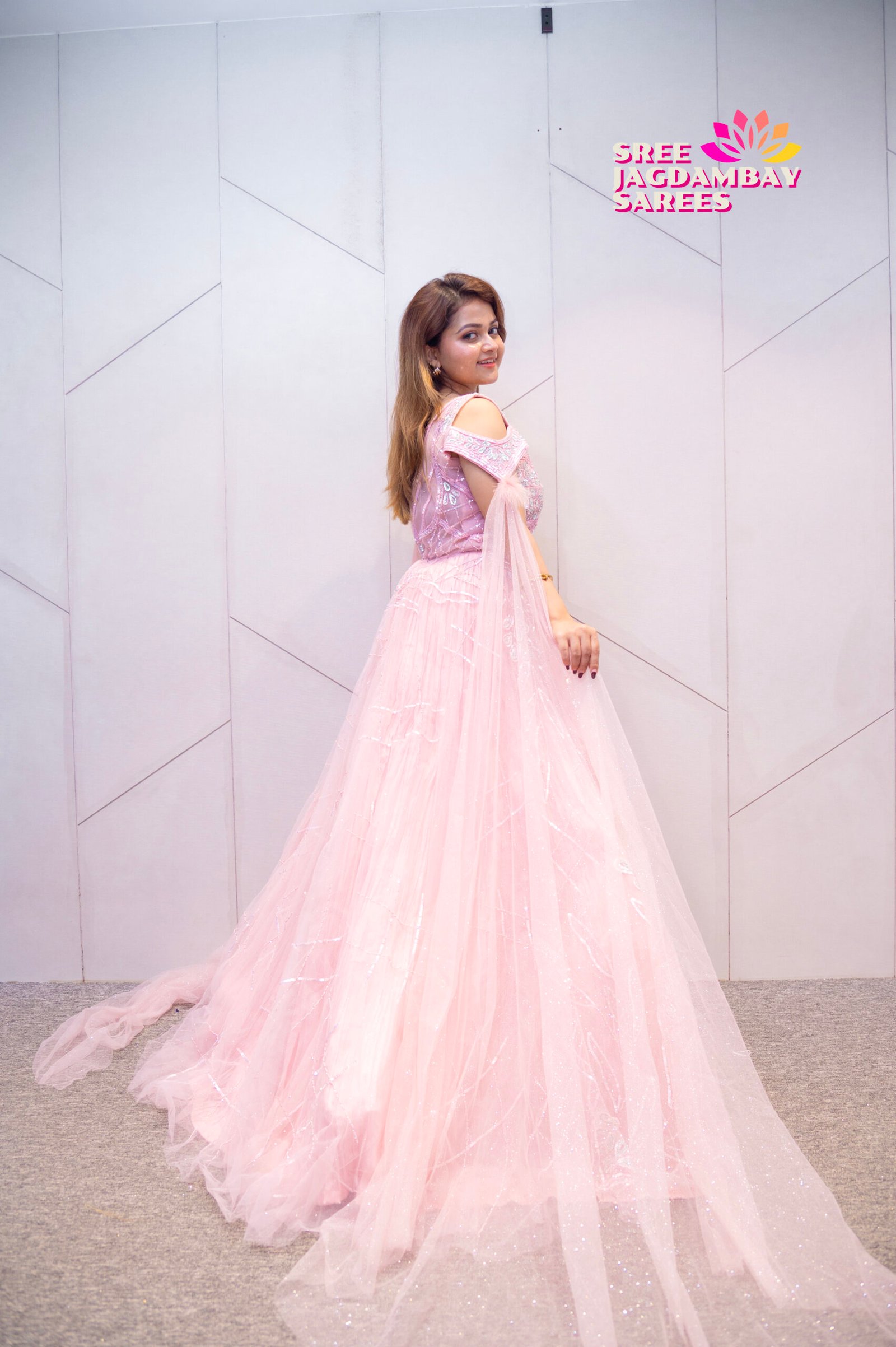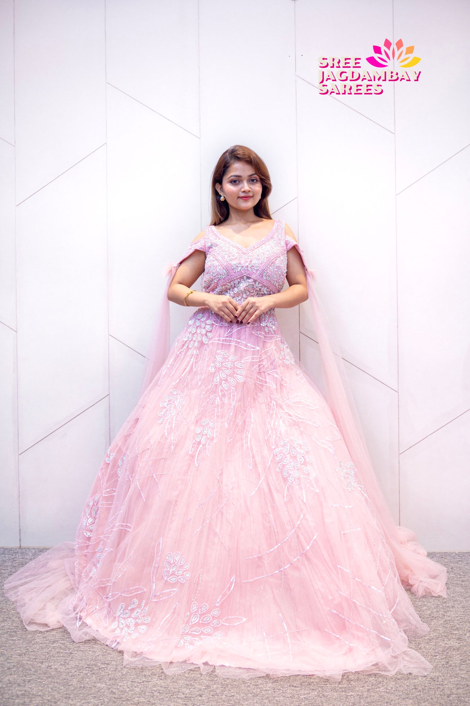 This stunning blush-pink gown is made from high-quality soft net fabric, offering a lightweight, flowy, and comfortable drape. The gown is beautifully adorned with intricate thread and sequin embroidery throughout the bodice and skirt, creating a sparkling and graceful effect.