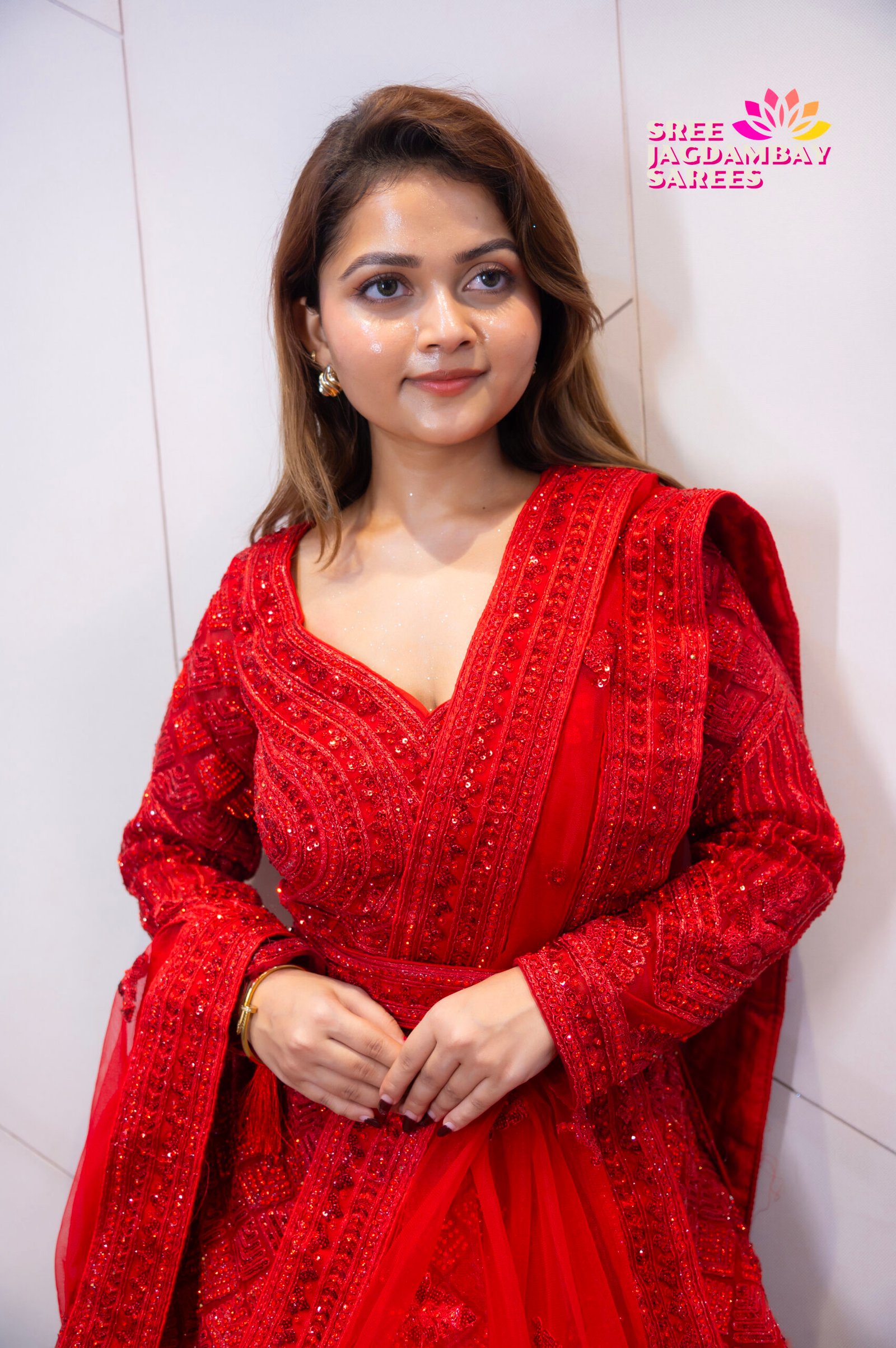 The lehenga is beautifully designed with all-over heavy embroidery and sequin work, giving it a luxurious shine and royal finish. The deep crimson red colour enhances the bridal glow, making it a classic yet evergreen choice for modern brides.